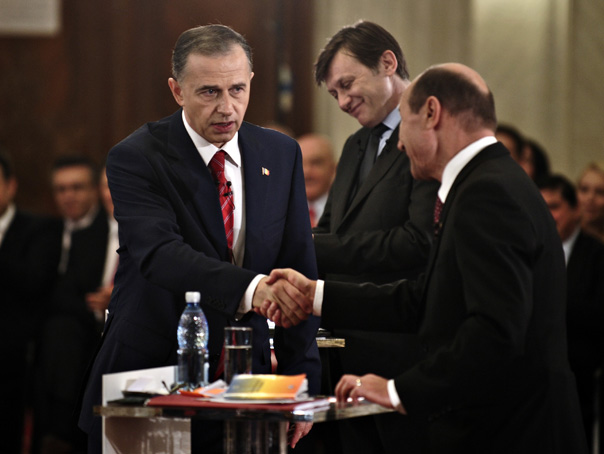 Traian Basescu (D) si Mircea Geoana se saluta in prezenta lui Crin Antonescu (C), in finalul unei dezbateri electorale, la Parlament, vineri, 20 noiembrie 2009. Candidatii la presedintie Traian Basescu, Crin Antonescu si Mircea Geoana au sosit la Palatul Parlamentului, pentru a participa la dezbaterea electorala organizata de Institutul pentru Politici Publice (IPP). ANDREI PUNGOVSCHI / MEDIAFAX FOTO