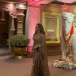 Vedeta a îmbrăcat o ținută strălucitoare, cu paiete aurii, care a ajutat-o să nu treacă neobservată. A asortat și bijuterii masive, tot aurii, și a atras privirile ca un magnet. Cu câteva zile înainte, tot la o petrecere organizată cu ocazia nunții, vedeta a purtat un saree cu negru și argintiu, confecționat tot dintr-un material sclipitor.